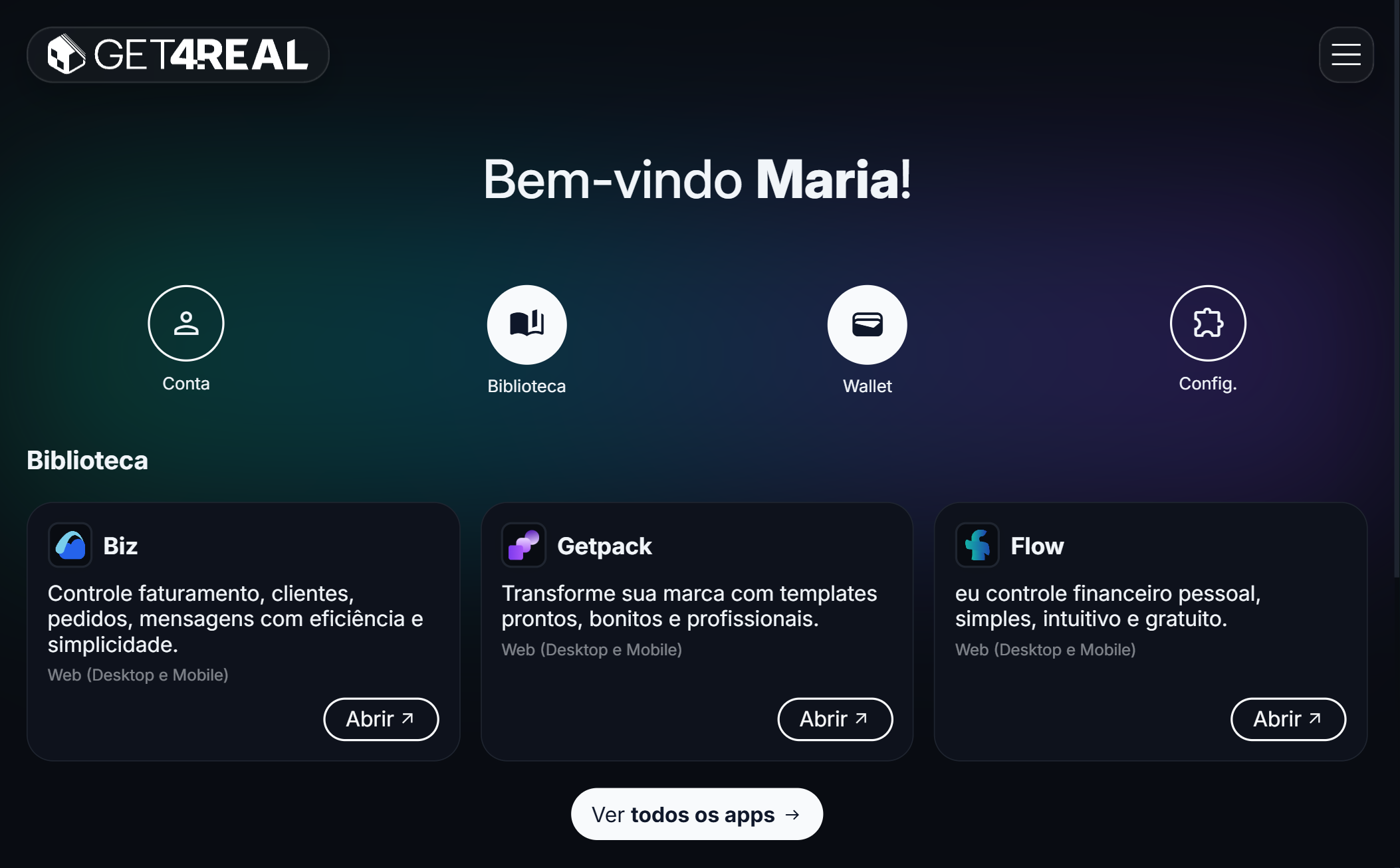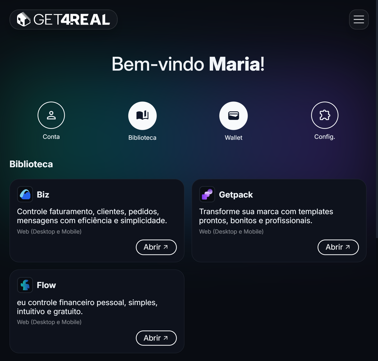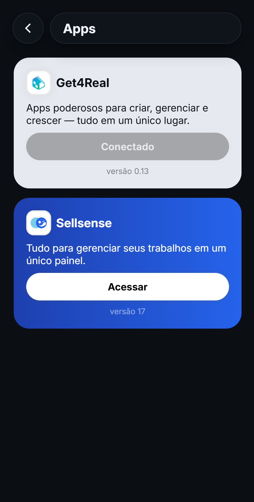 Acesse e gerencie seus aplicativos Get4Real em um só lugar, com login único e experiência consistente.